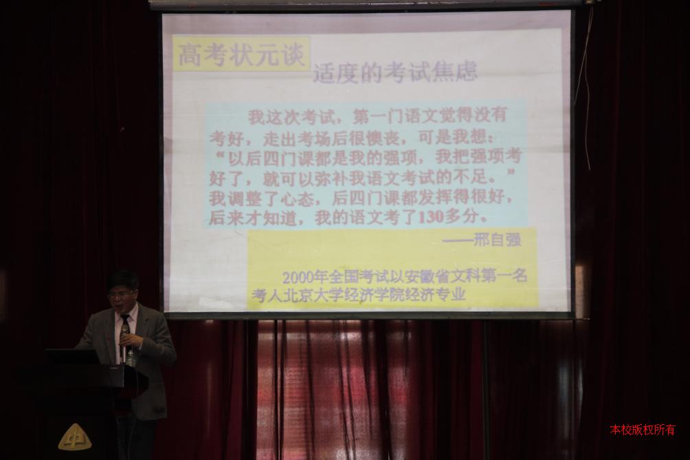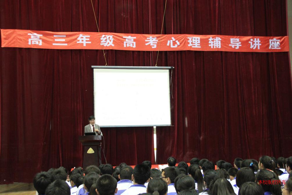 为使高三学子们能在考前更好地调适自己的心理状态,我校隆重邀请香港城市大学的岳晓东博士以“我要超常发挥”为主题,为全体高三师生举行了一场大型心理讲座。讲座中,岳晓东博士从高考的三大发挥状态入手,深入浅出,以轻松易懂的举例方式,让大家了解到考试能够超常发挥的先决条件,并列出可能导致考生发挥失常的“八大极端思维”,让同学们深刻地领悟到,“超常发挥是可以通过练习而达到的,并不是可遇而不可求的。”最后,岳博士以自己哈佛求学的亲身经历为引,为大家的生涯规划,做出了指导。很多同学表示“觉得挺振奋”,“确实学习和领悟到一些东西。”这次活动对于增强学生高考必胜的信心至关重要。