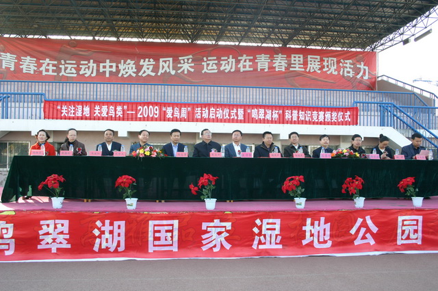 2009年3月30日下午,由自治区林业局、银川市科协、银川市湿地办主办,银川一中、鸣翠湖国家湿地公园承办的“关注湿地 关爱鸟类”------第五届“爱鸟周”活动启动仪式暨“鸣翠湖杯”科普知识竞赛颁奖仪式在银川一中举行。 此次活动的主题是:“关注湿地 关爱鸟类”。活动前期,组委会组织银川一中500多名同学参加了湿地科普知识竞赛。 启动仪式上鸣翠湖湿地公园的同志为同学们做了有关湿地以及鸟类生存、栖息地的讲座。随后,银川一中学生代表宣读了《关注湿地、关爱鸟类倡议书》。到会的领导为科普知识竞赛获奖同学颁发奖状。作为爱护鸟类的使者,同学们在长卷上签下自己的名字,真切的体会保护鸟类的重要性。 随着此次“爱鸟周”活动的启动,在全区范围内将掀起关注湿地、关爱鸟类的热潮。通过生态宣传教育活动的举办,进一步激发青少年保护鸟类、热爱自然的热情,将爱鸟行动深入其中。同时也借此呼吁全社会共同关注生态保护,努力营造人与自然和谐相处的良好氛围。