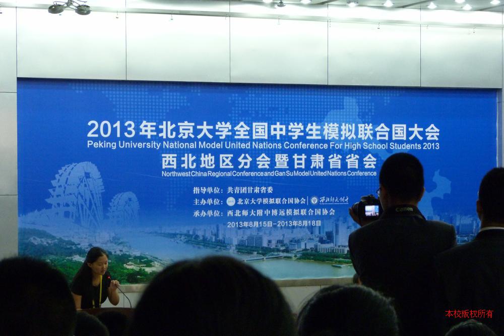 2013年8月15日至18日,我校4名参会代表和领队老师一同前往西北师范大学附属中学参加PKMUNC-NWCRC2013 北京大学全国中学生模拟联合国大会·西北地区分会。会议期间,我校代表与陕西师范大学附属中学、江苏张家港外国语中学、西北师范大学附属中学等学校的参会代表们同台竞技,在短短几天的时间内结下了深厚的友谊,学习到了许多有益的知识,积累到了许多宝贵的经验。北京大学全国中学生模拟联合国大会(简称 PKUNMUN) 是全国第一个面向中学生的模拟联合国大会,到2013 年 3 月已经成功举办 9 届,见证了全国上千名优秀高中生风采。而模拟联合国活动是模仿联合国及相关的国际机构,依据其运作方式和议事原则,围绕国际上的热点问题召开的会议。参会中学生分别扮演不同国家的外交官,作为各国代表,参与到“联合国会议”之中。代表们遵循大会规则,在会议主席团的主持下,通过演讲阐述自己所代表国家的观点,为了该国利益进行辩论、游说,与所属BLOC成员国代表一同合作,在“联合国”的舞台上充分发挥自己的才能。模拟联合国是是一项极富教育意义的活动。它能够开阔中学生的视野,激发中学生的学习潜能,锻炼中学生的社交风度,培养中学生的领袖才能,以及时间管理、危机处理、团队合作、沟通与妥协等多方面能力。模联即磨练,它是一个可以磨练自身,快速成长的舞台,在模拟联合国会议中你需要摒弃自己的感性因素,以全理性的思维投入到会议中,充分扮演好自己所应扮演的角色,为己方利益而奔走、游说、交涉、坚持、妥协,最终实现利益最大化;同时,在模联会议中你也可以找到与自己志同道合的朋友。特别值得一提的是,在本次我校所派出代表团的分属三个会场的4名代表中,刘涛、代天元荣获“最佳代表”称号,刘潇荣获“最佳外交风度”荣誉称号,在历史安全理事会会场中由银川一中同学组成的“英国代表团”荣获“最佳代表团”荣誉称号。在此对我校获得的荣誉表示衷心的祝贺,愿在以后的模拟联合国活动中再接再厉,更创辉煌。