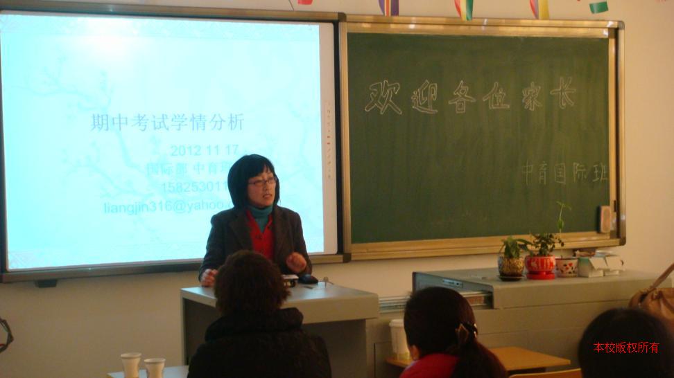 为沟通学校国际部的教育理念和教育孩子的方式,真正达到家校携手共同培养孩子的目标,对孩子的教育形成合力,落实中育班教学目标和银川一中国际部教育理念,银川一中中育国际部于2012年11月17日早上召开了以“为我们共同的目标:沟通、理解、合作”为主题的家长会。