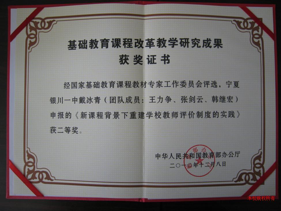 2010年12月8日,经国家基础教育课程教材专家工作委员会评选,我校申报的《新课程背景下重建学校教师评价制度的实践》获基础教育课程改革教学研究成果二等奖。