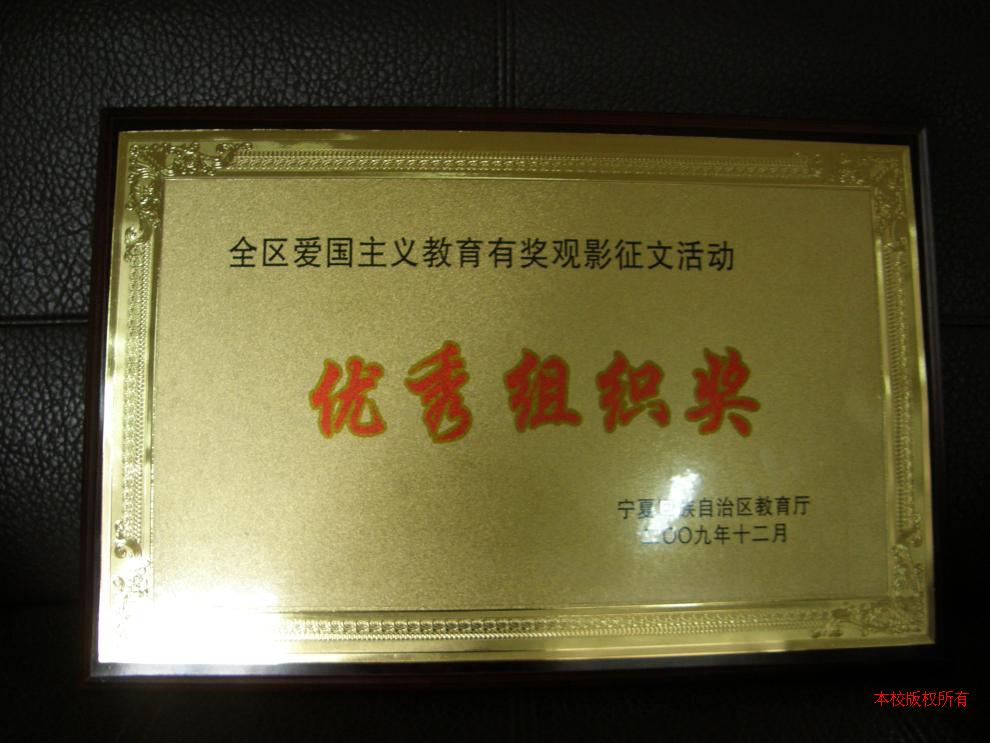 为庆祝建国60周年,加强全区中小学生爱国主义教育工作,丰富广大青少年的课余文化生活,促进他们健康成长,自治区教育厅联合宁夏电影公司于2009年暑期举行了“第四届暑期学生电影节暨爱国主义教育有奖征文观影活动”。我校认真组织,悉心指导,获奖数量多,获奖层次高,获奖率占全区50%,一等奖2个;二等奖3个;三等奖3个;优秀奖10个。