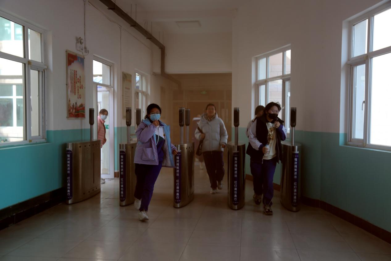 模拟火情发生后,学生公寓楼内立即响起疏散警报。各楼层疏散指挥员迅速到位,引导学生分别从东西两侧安全通道,快速有序地撤离至校园篮球场指定区域。疏散途中,住宿学生严格遵循“捂口鼻、低弯腰”的规范动作,全程不慌乱、不抢道、不拥挤;参与演练的教职工各司其职、指挥到位;校医团队全程待命,随时提供应急医疗保障。
