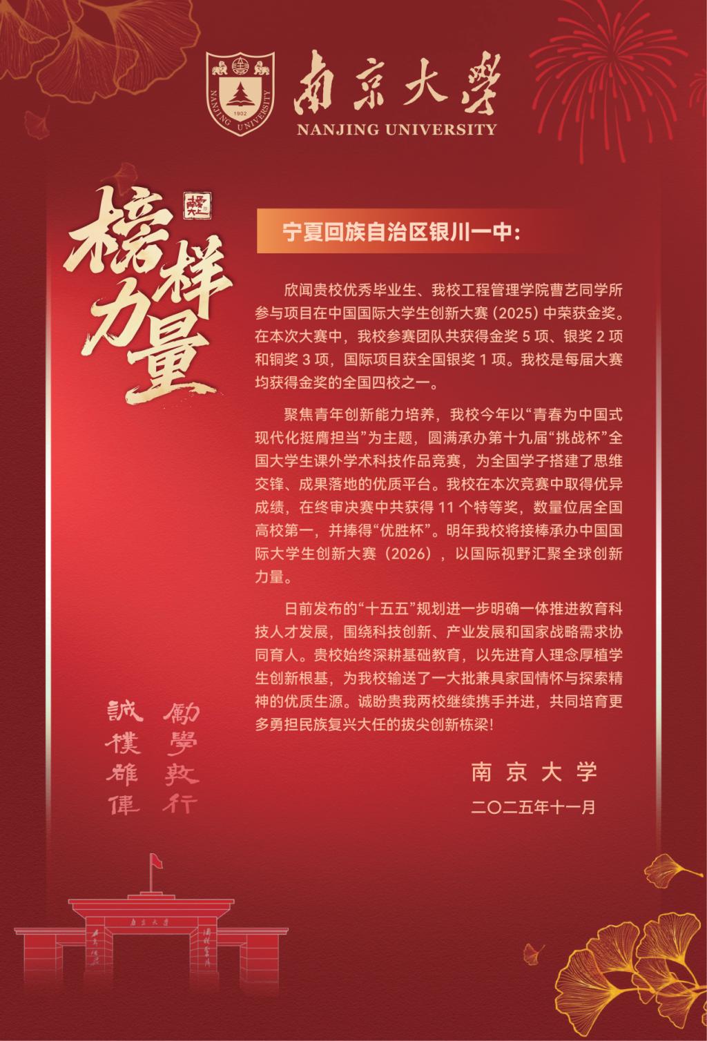 曹艺同学系宁夏银川一中2019届12班毕业生。在校期间,她笃学精进、品学兼优,以扎实的学业基础、突出的综合素养在同辈中脱颖而出,展现出卓越的学习能力与责任担当。现就读于南京大学的她,秉持创新探索精神深耕专业领域,其参与的项目在2025年中国国际大学生创新大赛中历经多轮角逐,凭借过硬的专业水准与鲜明的创新价值斩获金奖,充分彰显了青年学子的奋进姿态与综合实力。