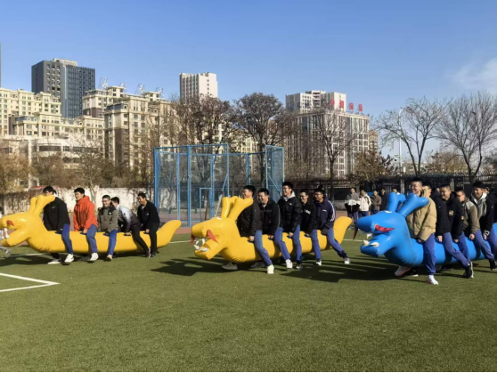 龟兔偕行,趣意盎然。五人共乘器械,紧握把手同步发力,腰背协同带动器械凌空疾驰。摒弃急躁、稳扎稳打,趣味比拼里既有少年人灵动的反应,更有团队沉稳的节奏,每一步踏实迈进,都书写着同心向远、共赴荣光的青春篇章。