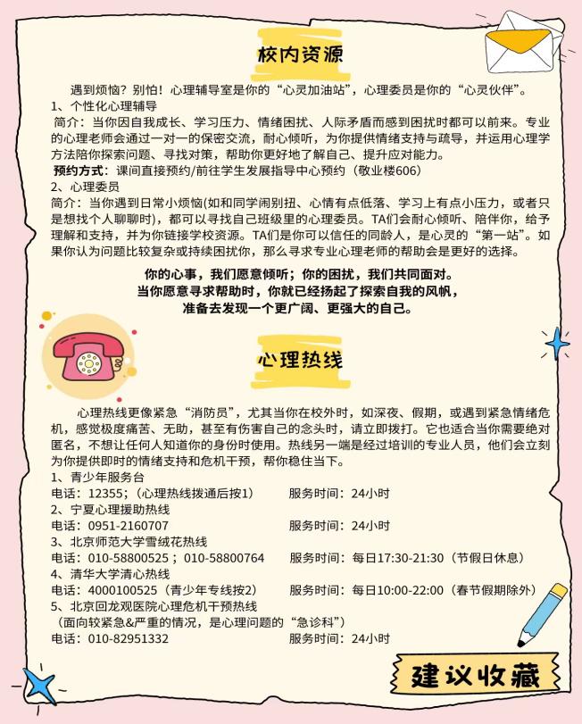 心理组的老师们经过资源的整理与筛选,已将这份“心灵守护包”发放给各班级,并在日常的引导中让学生感受到:成长里的情绪波澜,从不是你一个人的 “孤军奋战”。