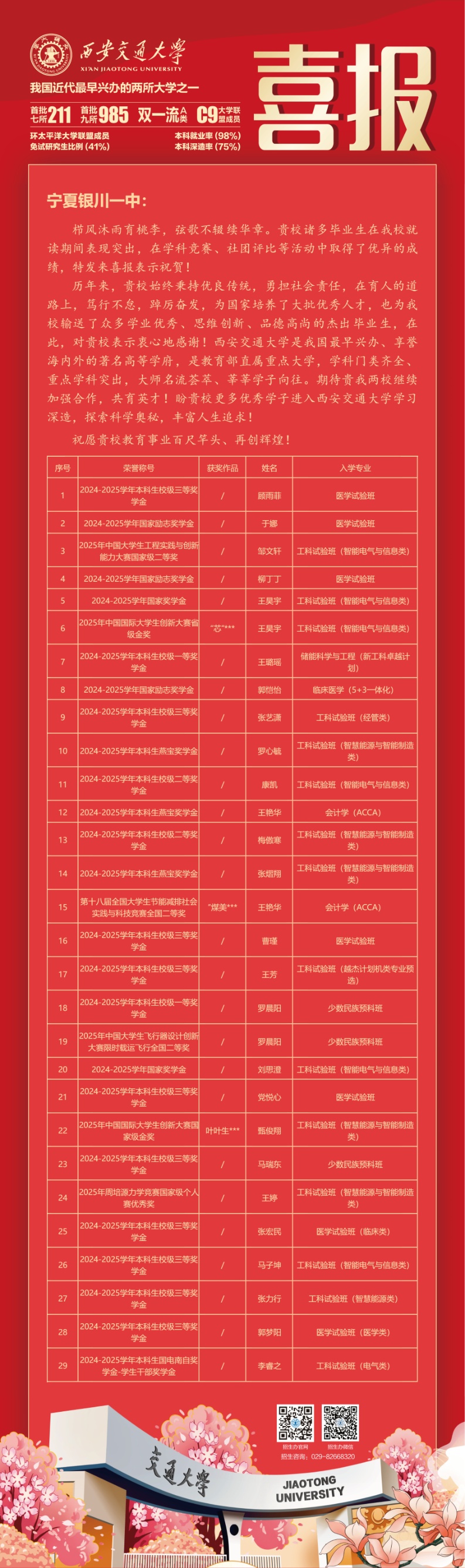 弦歌不辍育英才,捷报频传展风采。近年来,宁夏银川一中聚焦大中衔接育人关键,倾力培育拔尖创新后备人才,培养出一批批胸怀远志、学养深厚的优秀学子。他们从塞上校园的课堂迈步,走进西安交通大学的学术殿堂,凭借扎实的专业素养与卓越的创新思维,在大学阶段屡创佳绩,斩获各类奖学金,尽显卓越风采。