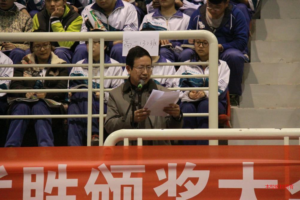 紧接着,王力争校长为大会作了热情洋溢的动员报告,为高三年级全体师生加油鼓劲壮行助威。他勉励同学们要坚定信心、志存高远、不怕吃苦、分秒必争、全力冲刺,用恒心、毅力和智慧,战胜一切困难;感谢老师们三年的辛勤付出,并要求老师们再接再厉做好最后100天的学法指导和心理疏导,希望高三全体师生能同舟共济,再创辉煌。会上,张剑云副校长宣布了2013-2014学年上学期期末考试高二年级优胜学生名单和2013年各类奥赛获奖学生名单及奖励。学校领导给获奖学生颁发了奖状,并向他们表示祝贺。最后,高三年级各班依次进行庄严宣誓,振奋人心、高亢嘹亮的誓词不绝于耳。