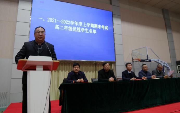 副校长刘丁宣读2021-2022学年上学期期末考试高二年级优胜学生名单和2021年各类学科竞赛获奖学生名单及奖励。