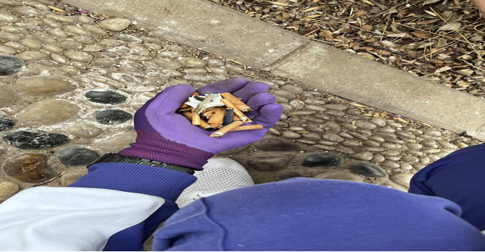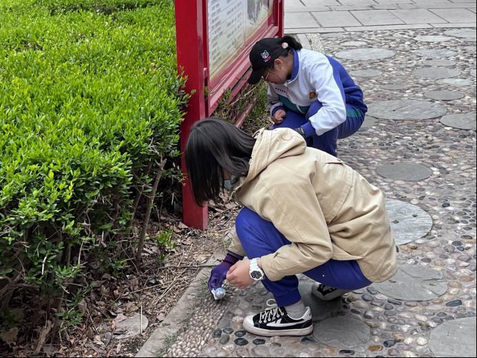 戴手套的同学手上是满满的烟头,手持夹子的同学夹起了五颜六色的包装袋、糖纸和饮料瓶。