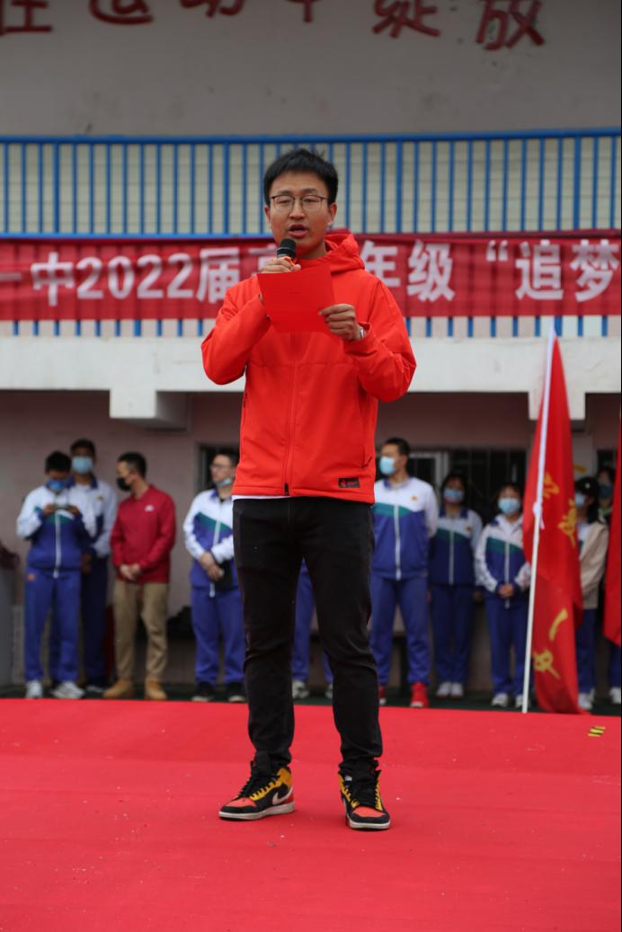 千磨万击还坚劲,任尔东西南北风。雨后初霁、微风稍寒,但高三学子们却无惧雨打风吹,一个个精神抖擞、身姿挺拔地整齐列队于足球场上。高三年级组长韩创龙以激昂铿锵的发言为高三学子们鼓劲加油。张永宏校长为各班旗手授旗,宣布“追梦励志行”活动正式开始。