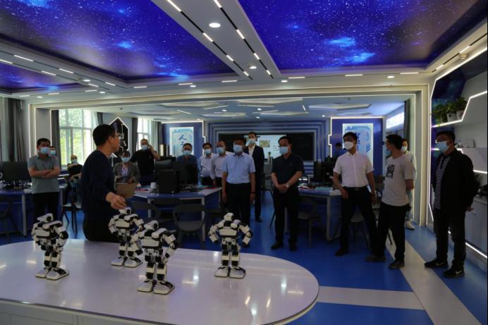 谭天明老师讲解我校人工智能课程设置及授课流程,演示由学生应用开源硬件编写的人脸识别软件和机器人舞蹈程序,令调研组眼前一亮、赞叹不已。