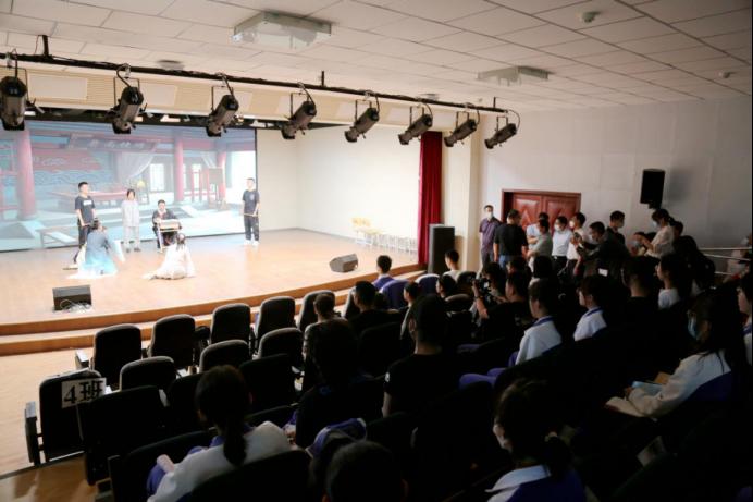 调研组参观我校沉浸式阅读课程现场教学。魏天老师带领学生在小剧场中表演课本剧、文学剧,师生共同评析、鉴赏文学艺术,深刻理解语文课程内容,感受文学、文化魅力。
