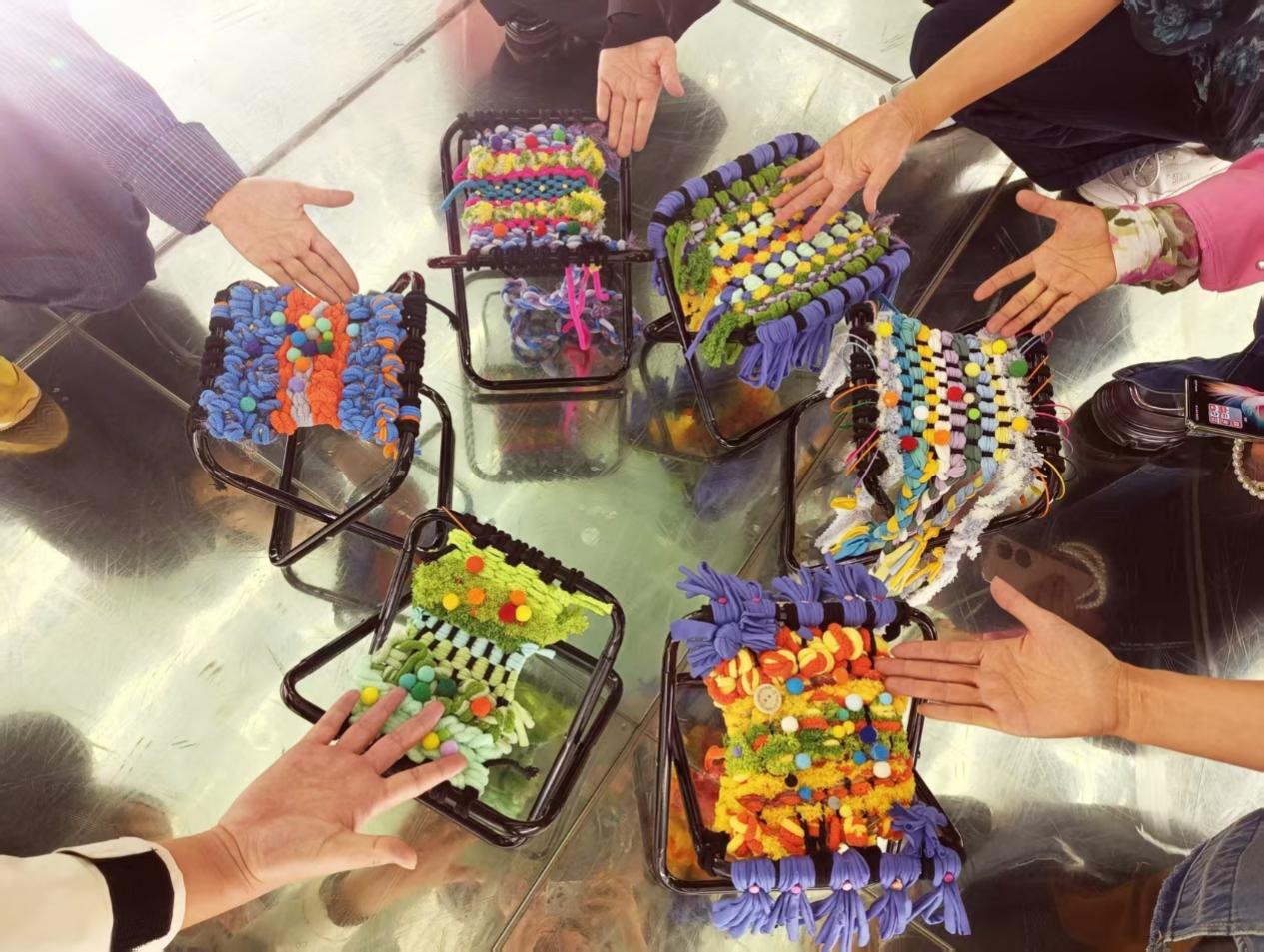 教研活动首站,教师们沉浸于“纤维与脉络”主题展览中,从一幅幅、一件件精湛的艺术作品中汲取创作养分与教学灵感。活动核心环节——“指尖穿梭,编织匠心”艺术小马扎创作实践,在专业导师指引下,教师们化身为专注的创造者,以经纬为语言,与色彩对话,将个人的美学思考与对材质的理解,一一线织于马扎方寸之间,既让老师们体验了从灵感到实物的完整创作过程,又深刻感悟到艺术与生活交融的本真魅力,为教学实践注入了源头活水。