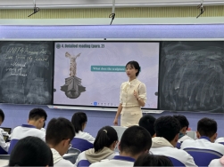 孙紫涵老师的阅读课以Unit4 Amazing Art之“Live From the Louvre”为主题,采用“P–W–P”阅读模式与任务型教学法,以小组合作形式让学生模拟直播介绍三件艺术品。结课时引用名言强化艺术审美认知,作业设计兼顾书面整理与视频拍摄,实现知识迁移与能力分层培养。