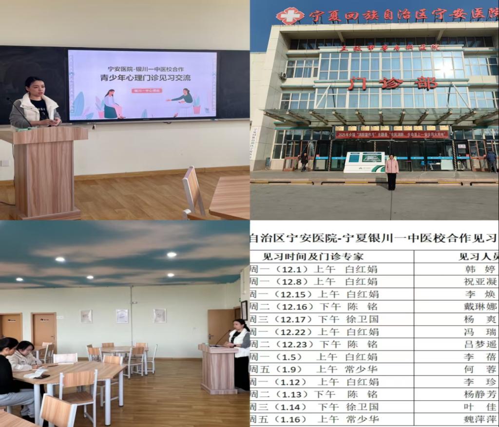 为深化青少年心理健康教育实践,破解校园心理辅导工作中的专业难题,我校心理教研组组织银川一中教育集团的多名心理教师,赴宁夏宁安医院儿童青少年精神科门诊开展专项见习活动,以医校联动为纽带,为心理教师专业能力提升搭建实战平台。