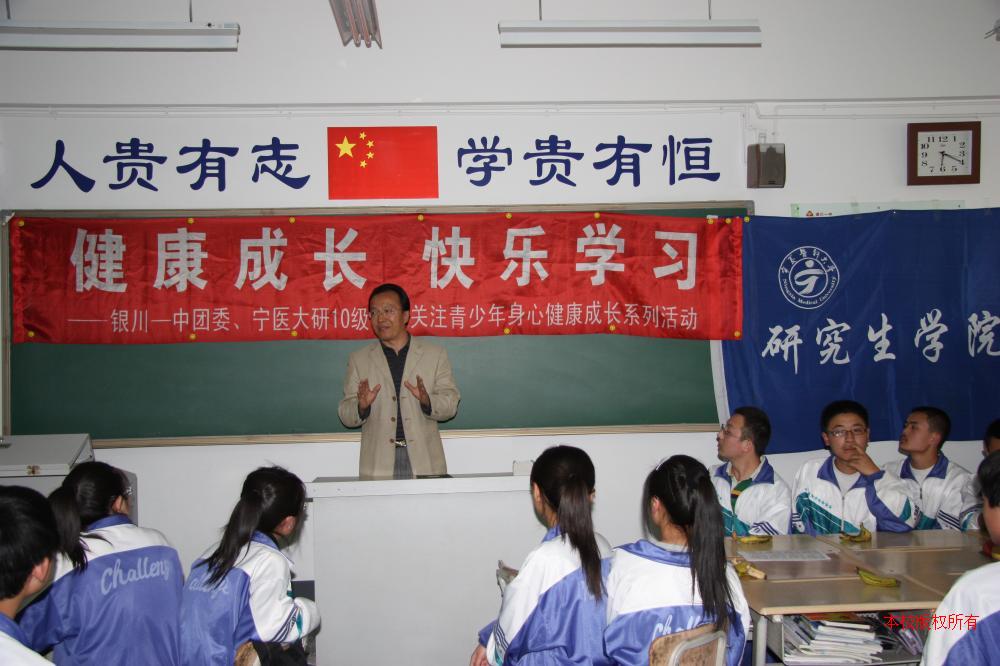 2011年4月11日,宁大医学院研究生五班党支部与我校高二宏志班团支部进行题为“ 健康成长,快乐学习”的主题团日,医学院哥哥姐姐们利用他们的专业知识,对高中生所困惑的心理和生理知识进行了讲解,对如何树立正确的人生态度、如何对待学习压力、如何理解高中生早恋、高中生活与大学生活的区别等进行了深度的交流。为了能够顺利有效地开展这次主题团日活动,哥哥姐姐们提前与我们支部交流,并进行了问卷调查,考虑到我们支部的大多数学生是住校生,他们还特意去购买了水果,让我们感到非常温暖。此次活动也受到了学校领导的高度重视,蔺晓林副校长、团委赵莉书记和我校心理健康教育中心刘芳玲教师也参加了这次主题团日活动,阳光电视台录制了活动的全过程,会议结束时蔺晓林副校长进行了总结讲话,充分肯定了此次活动的形式和意义,并对我们今后的学习和生活提出了要求。我们会牢记“宏图寄党恩、志远为国强”努力学习,争取早日成为对祖国有用的人!