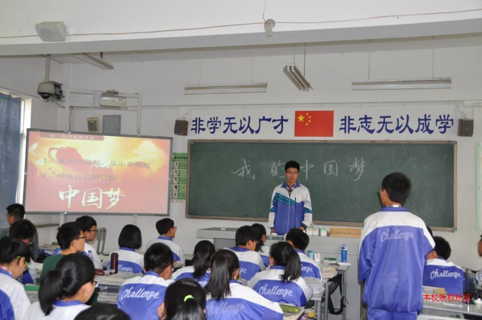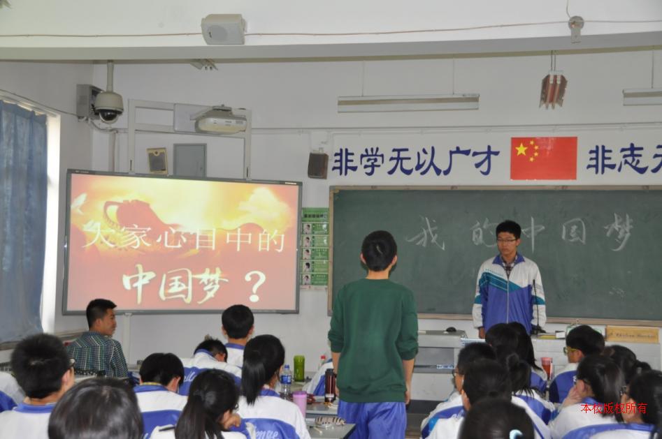 少年兴则国兴,少年强则国强,通过同学们畅谈自己的梦想,通过主持人引导,将个人梦想和国家梦想紧密结合,接着通过提问的方式让大家思考:我们目前能为自己的梦想、国家的梦想做些什么,使用案例进行提示,让同学们了解自己目前的目标是什么,同时播放CCTV有关中国梦的宣传片,激发大家的灵感,每人拿出一张纸,写出自己的中国梦,接着在班内进行展示宣读,阐述自己写下这个梦的原因。