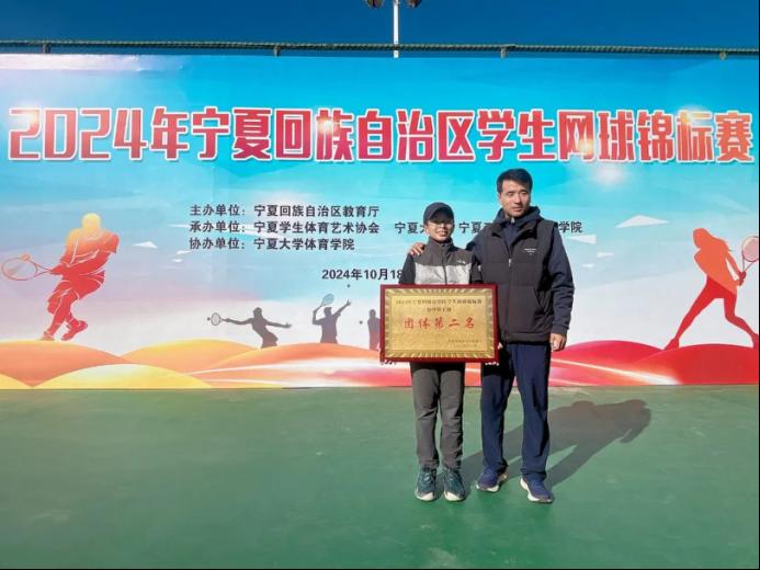 10月18日至20日,全区学生网球锦标赛在宁夏大学怀远校区举行。在我校曹磊老师和郭江老师的指导下,杨笑涵、文睿泽、杨雨菲、马云烟同学取得了优异成绩。他们在激烈的比赛中脱颖而出,荣获佳绩:杨笑涵、文睿泽获得男子团体第二名;杨笑涵获得男子双打第二名、混双第三名、单打第四名;杨雨菲获得混双第三名;马云烟获得女子单打第五名。四位同学的出色表现不仅为我校赢得了荣誉,也展现了他们的坚韧不拔和卓越才能。