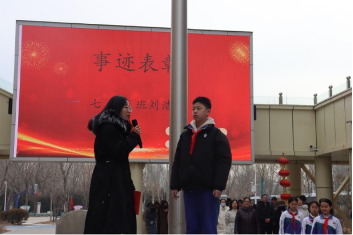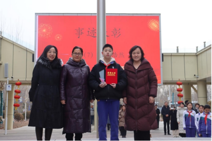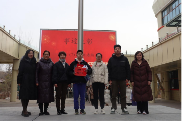 为弘扬刘浩然同学见义勇为的精神,2月24日上午,我校在升旗仪式上隆重举行表彰大会。会上,李红华校长授予其“湖畔好少年”荣誉称号,刘淑萍副校长为刘浩然同学颁发荣誉证书及奖杯。泰利尔服装公司(校服供应商)和世纪清华书店被刘浩然同学的义举所感动,分别赠予刘浩然同学赠送两套校服及200元读书卡。政教处主任彭海梅为刘浩然同学在颁奖宣读颁奖词:“刘浩然同学的勇敢与智慧,是我校‘生命至上,安全第一’教育理念的生动体现。希望全体同学以他为榜样,争做安全知识的践行者、文明社区的守护者!”
