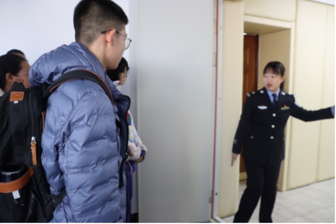 同学们在法院干警的引导下通过安检进入法院,在审判法庭“零距离”旁听一起帮助信息网络犯罪活动罪案件的审理,“沉浸式”体验法律的严谨与正义。