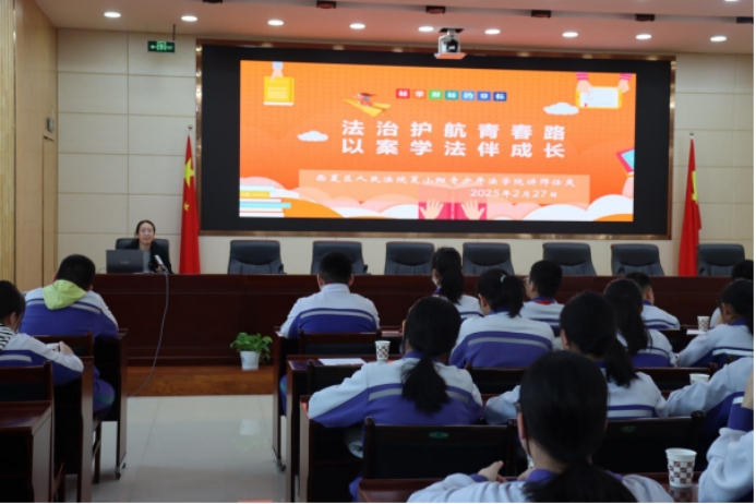 刑事审判庭干警任爽以“法治护航青春路 以案学法伴成长”为题为同学们讲授了一堂生动的专题讲座。主讲人结合《中华人民共和国民法典》《中华人民共和国未成年人保护法》等相关法律法规,围绕未成年人保护、预防青少年犯罪等主题进行讲座,通过相关真实案例,分析青少年容易涉及的犯罪类型,如校园霸陵、网络犯罪等,警示大家远离违法犯罪,同时现场讲授如何识别和防范不法侵害,增强自我保护意识和能力。