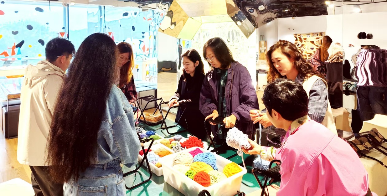 教研活动首站,教师们沉浸于“纤维与脉络”主题展览中,从一幅幅、一件件精湛的艺术作品中汲取创作养分与教学灵感。活动核心环节——“指尖穿梭,编织匠心”艺术小马扎创作实践,在专业导师指引下,教师们化身为专注的创造者,以经纬为语言,与色彩对话,将个人的美学思考与对材质的理解,一一线织于马扎方寸之间,既让老师们体验了从灵感到实物的完整创作过程,又深刻感悟到艺术与生活交融的本真魅力,为教学实践注入了源头活水。