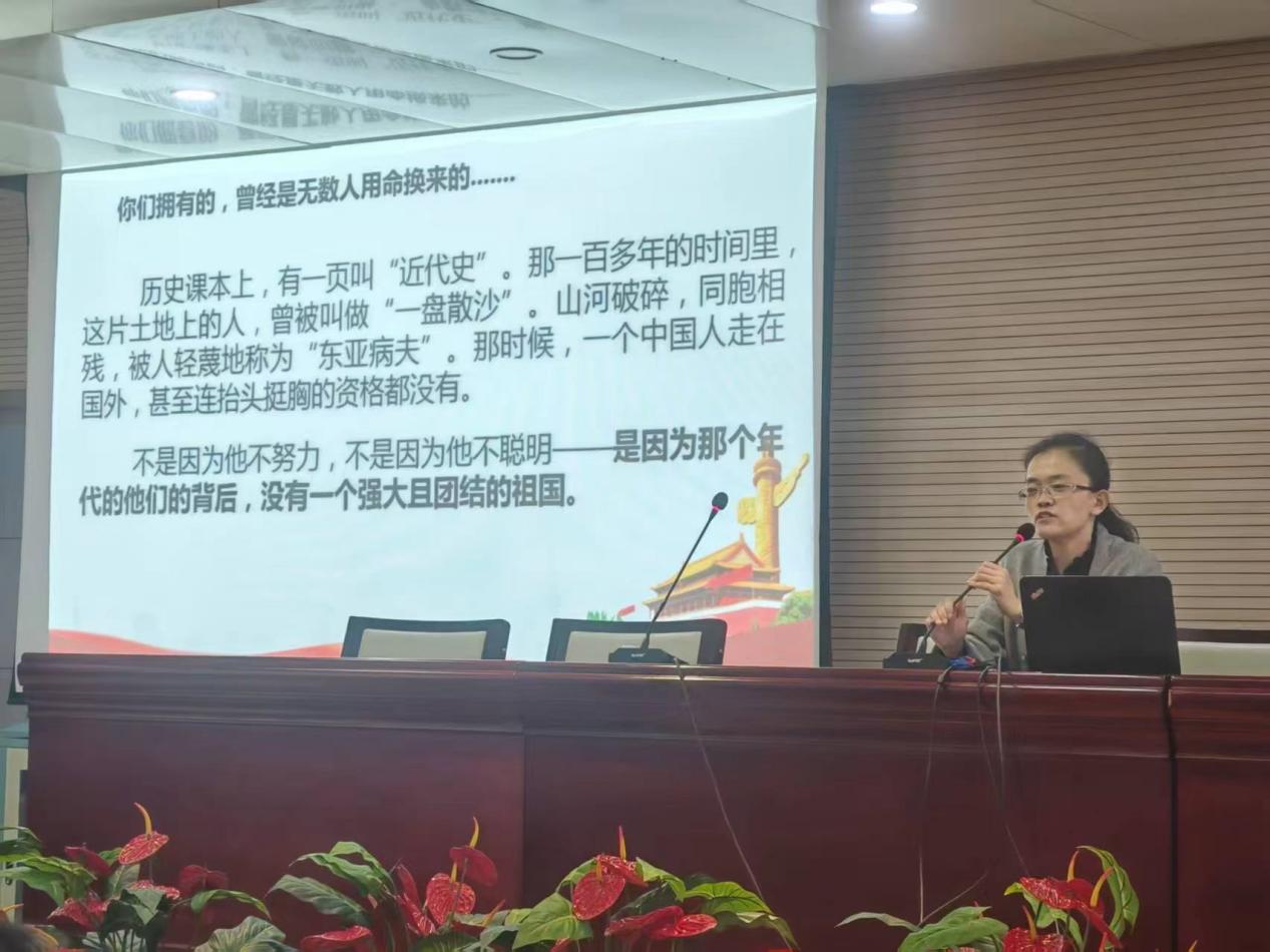 张校长首先立足当今国际局势,以“你想成为怎样的中国人?”为引,表明当代青年要明确中华儿女的身份,像石榴籽一样紧紧凝聚在一起,将个人理想深刻融入国家发展,珍视无数人用“我们”两个字换来的安稳与和平。张校长指出,当代青年应在国际变局中,守住这份中华民族历经时间沉淀的凝聚力,守住这份来之不易的“在一起”。