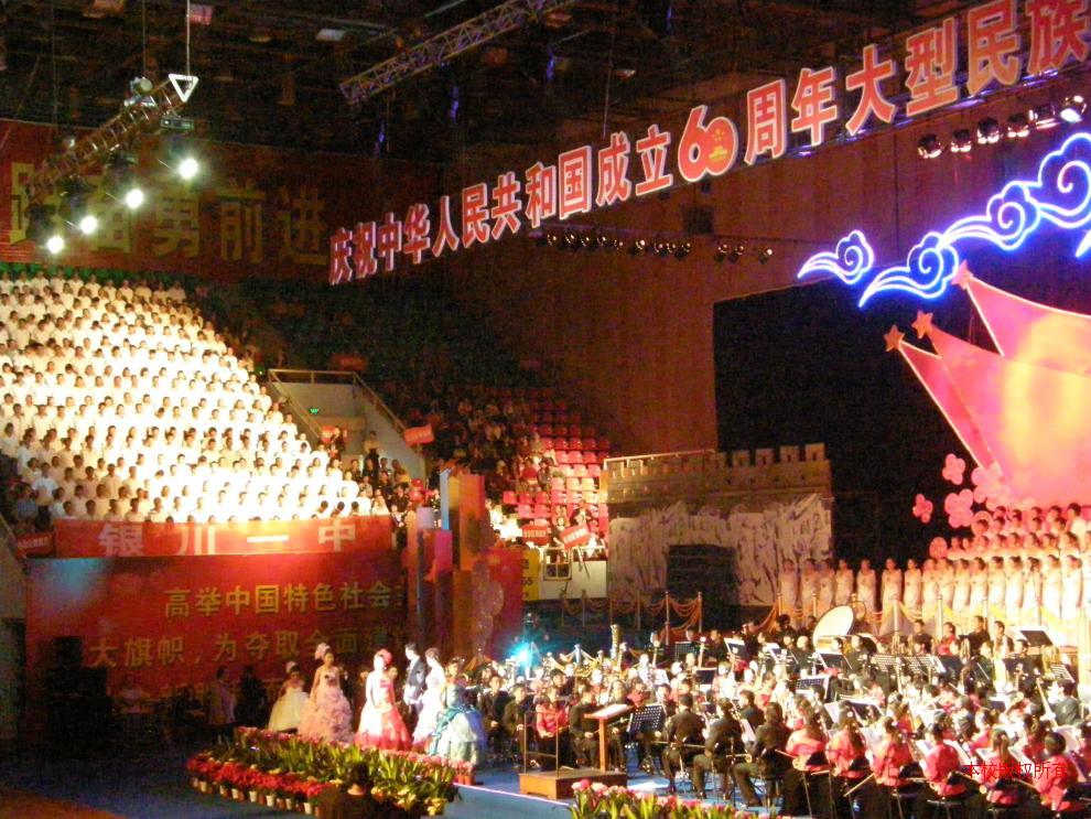 9月22日下午,我校300名同学参加了宁夏庆祝新中国成立60周年大型民族音乐会“红歌飘塞上”演出。 此次大型音乐会由自治区党委宣传部、宁夏军区政治部、自治区文化厅、自治区党委直属机关工委、自治区总工会、自治区教育厅和银川市政府联合主办,是宁夏庆祝建国60周年主题演出,旨在歌颂党的丰功伟绩,歌颂祖国及宁夏60年来日新月异的变化和经济社会文化发展取得的辉煌成就。